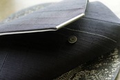 和の印象が強い数寄屋袋ですが、少し横長にして斜めのラインをずらしたことでよりモードにスタイリッシュな印象のあるバッグへと変身しました。芯地も厚めのものを選んだことで見た目にもハリがあり、持った時の印象も洗練されたものに。また程よい固さと手織り布の素材感が手に馴染み、ずっと触っていたくなるような手触りです。固さがあるので物の出し入れもしやすく、長財布やスマートフォン、リップなど外出にマストなアイテムがしっかり納まるサイズ感など機能性にもこだわりました。
